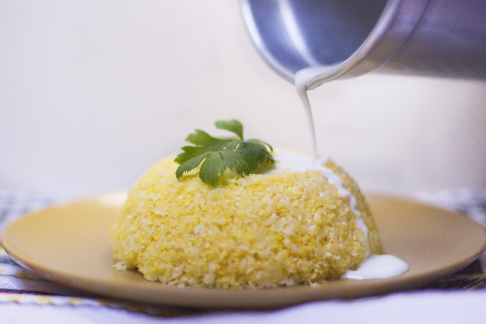 4. Desenforme o cuscuz no prato e regue com o leite quente. Sirva imediatamente.
