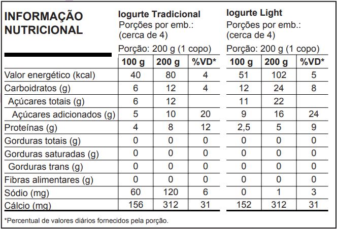 Leite pasteurizado desnatado, açúcar, preparado de ameixa (Água, açúcar, polpa de ameixa, aroma idêntico ao natural de ameixa, corante caramelo IV, espessante/estabilizante goma guar, espessante/estabilizante goma xantana, conservante sorbato de potássio e acidulante ácido cítrico), amido modificado, espessante/estabilizante goma guar, espessante/estabilizante goma xantana, conservante sorbato de potássio, aroma idêntico ao natural de ameixa, corante caramelo IV e fermento lácteo.