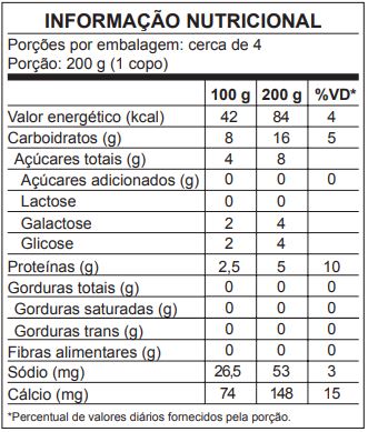 Leite desnatado e/ou leite desnatado reconstituído, preparado de maçã, mamão e banana (água, estabilizante amido modificado, polpas de maçã, mamão e banana, aromas idênticos aos naturais de maçã, mamão e banana, acidulante ácido cítrico, conservante sorbato de potássio, corante aificial crepúsculo), enzima lactase, edulcorante aificial sucralose, aroma aificial de salada de frutas, corante extrato de urucum, base norbixina e fermento lácteo.