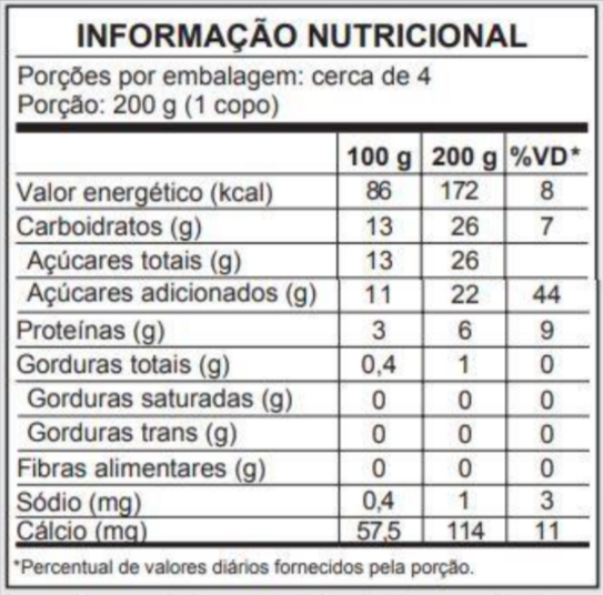 Leite desnatado e/ou leite em pó desnatado reconstituído, xarope (água e açúcar), estabilizante (açúcar, pectina e espessante goma guar INS 412), aroma idêntico ao natural de baunilha cítrica, corante caramelo IV INS 150d e fermento lácteo.